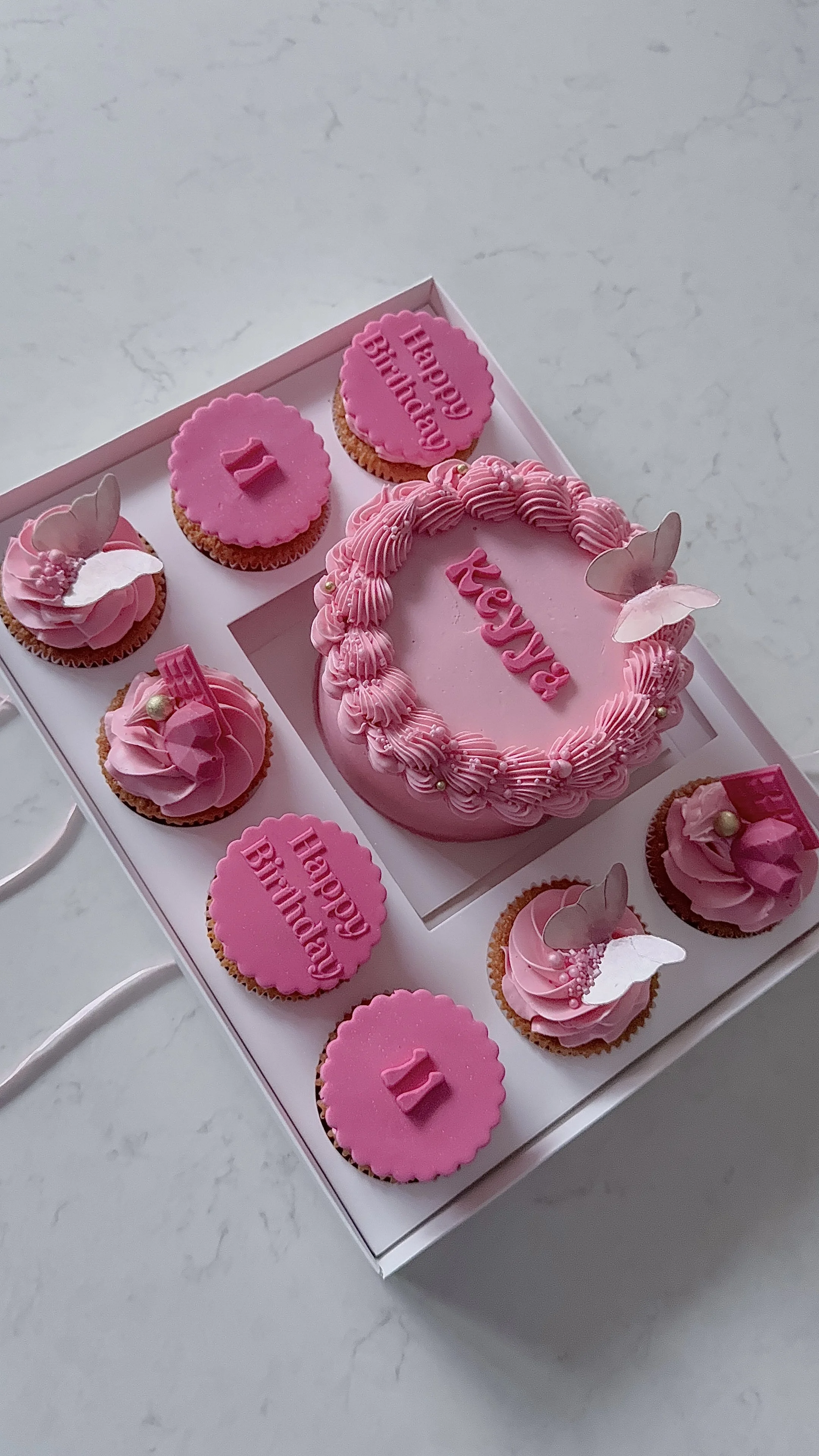 The Blush Couture Celebration Box features a vintage-inspired buttercream cake finished with delicate hand-piped borders, paired with coordinating cupcakes and embossed fondant details for a seamless, couture look.
